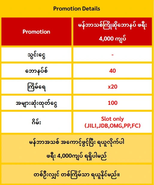 1. ဤပ႐ိုမိုးရွင္းကို တစ္ဦးလွ်င္ 1 ႀကိမ္သာ ရယူႏိုင္ပါသည္။