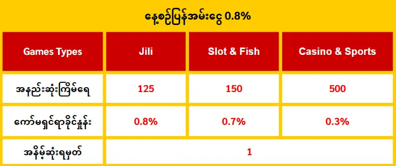 2.ကစားခဲ့တဲ့ စေလာ့ နဲ႔ ငါးဂိမ္းတိုင္းအတြက္ ၀.၇% နဲ႔ JILI ဂိမ္းေတြအတြက္ ၀.၈% ျပန္အမ္းေငြ ရရွိပါရွင့္။